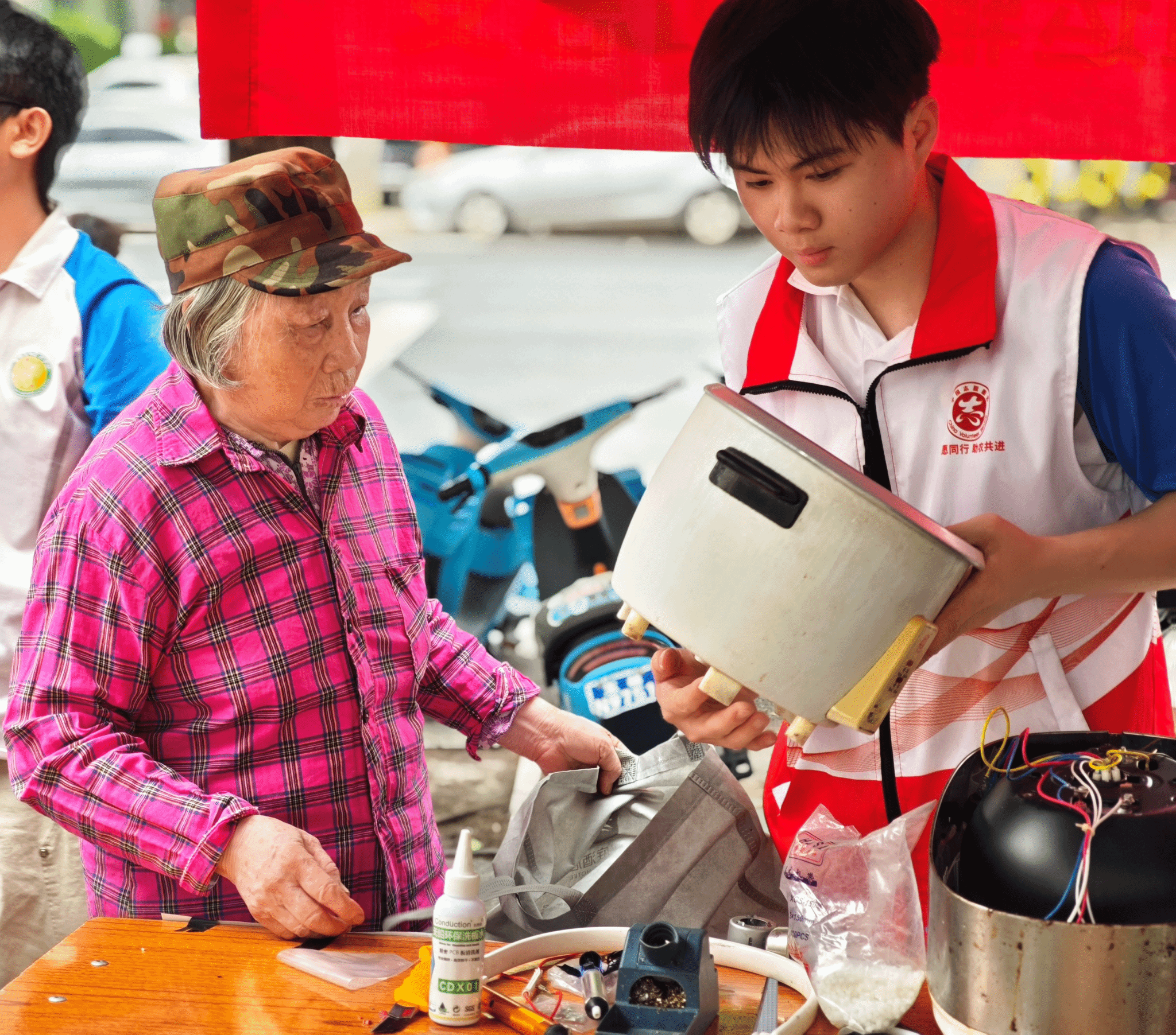 活动现场,各团总支立足专业特色打造的八大特色服务项目人气十足,成为最亮眼的“志愿风景线”。机械加工科团总支的3D创意设计体验区,让群众近距离感受科技创意的魅力;信息技术科团总支的AIGC数字技术指导台,耐心教大家运用智能工具解决生活难题,助力数字生活普及;财经商贸科团总支聚焦民生需求,开展反诈知识宣讲和个人所得税申报指导,为群众财产安全保驾护航;旅游服务与教育科团总支的雕刻展示、芒编教学现场,师生手把手传授传统技艺,让匠心文化薪火相传;农林牧渔科团总支带来的惠民空心菜售卖,以新鲜实惠的农科成果服务师生群众,尽显专业特色;交通运输科团总支的家电维修点、免费洗车服务站前排起长队,志愿者们细致排查故障、认真清洗车辆,切实解决日常小烦恼。一抹抹“志愿红”忙碌在各个服务点位,用热情的态度、扎实的技能诠释奉献内涵,让雷锋精神在实践中落地生根。