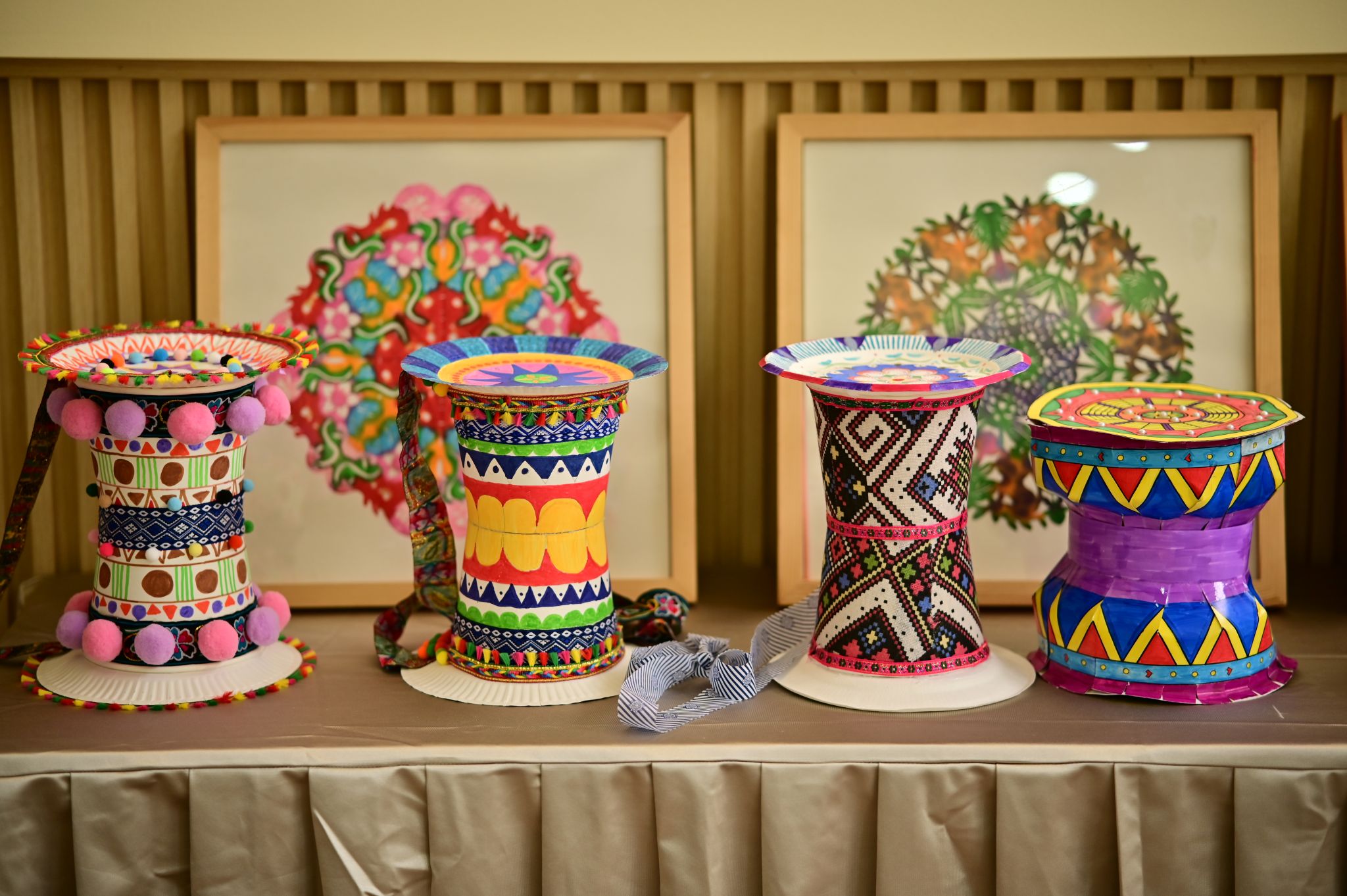 “共绘同心圆”民族文化艺术作品展区的作品格外亮眼。本次作品展面向全校征集,绘画、手工两大品类齐亮相,作品紧扣广西民族风情、玉林地域特色与壮锦文化元素,色彩明快、创意十足。主题绘画作品色彩鲜艳,一笔一画勾勒民族风情;手工作品精巧别致,融入民俗符号与非遗灵感,匠心满满。每一件作品都承载着同学们对民族文化的热爱,用艺术语言诉说民族故事。