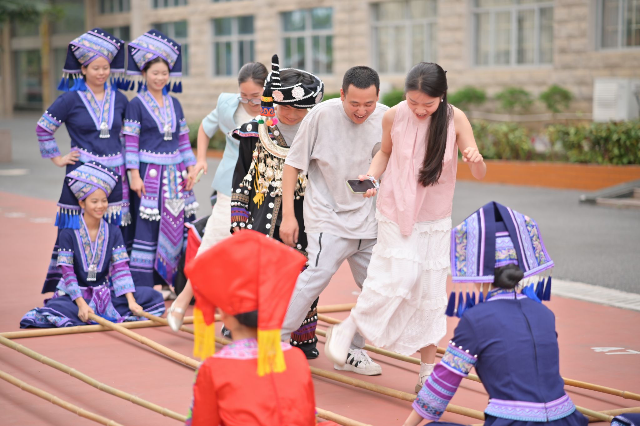 动现场歌声悠扬、舞步灵动。壮族嘹歌、经典民歌轮番唱响,旋律质朴高亢、韵味悠长,唱出壮乡儿女的热情与豪迈;竹竿舞展演节奏欢快、步伐轻盈,击竿声与欢笑声交织,师生踊跃参与、默契配合,在一开一合间跳出青春活力,尽显民族体育独特魅力。