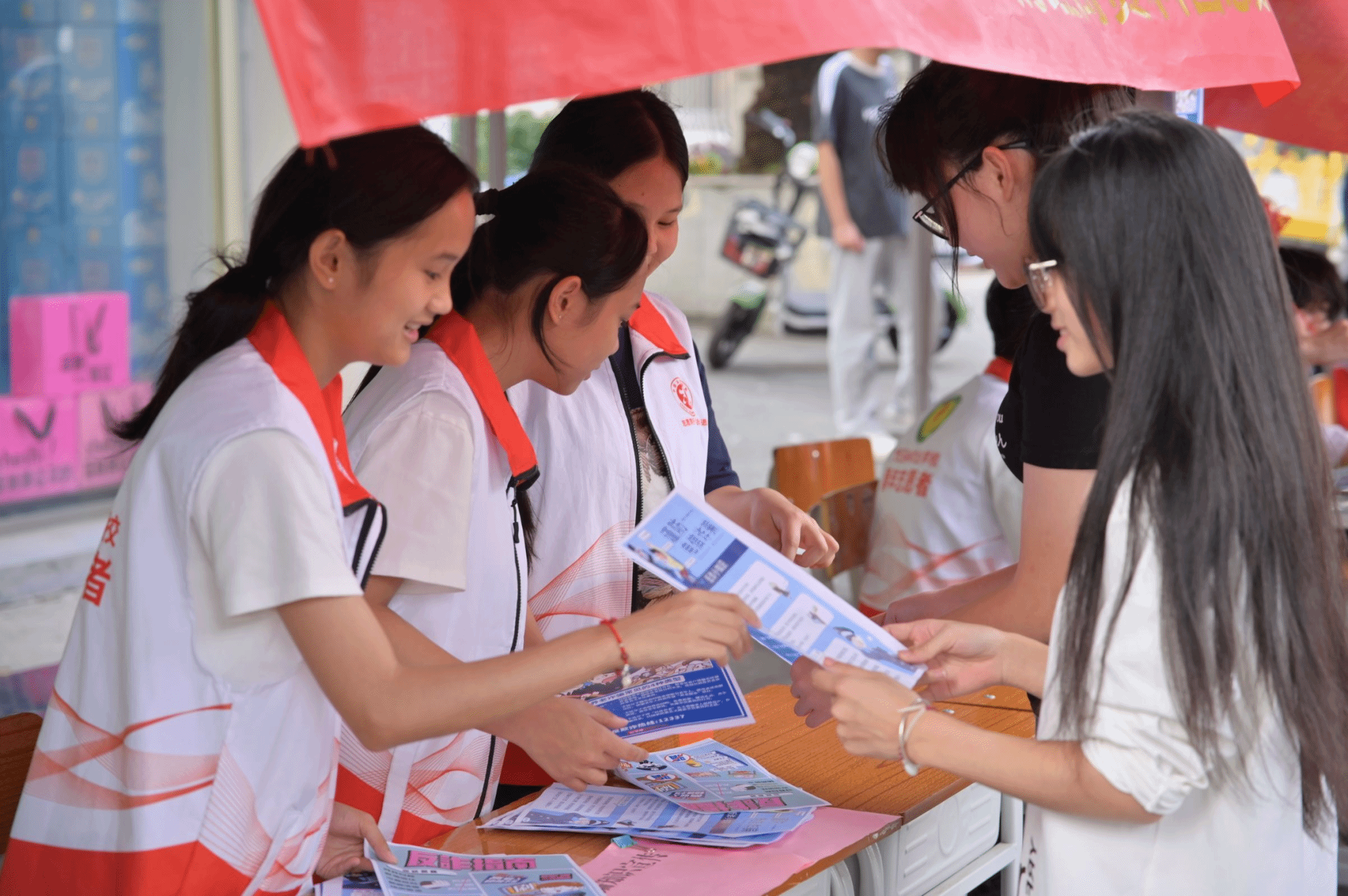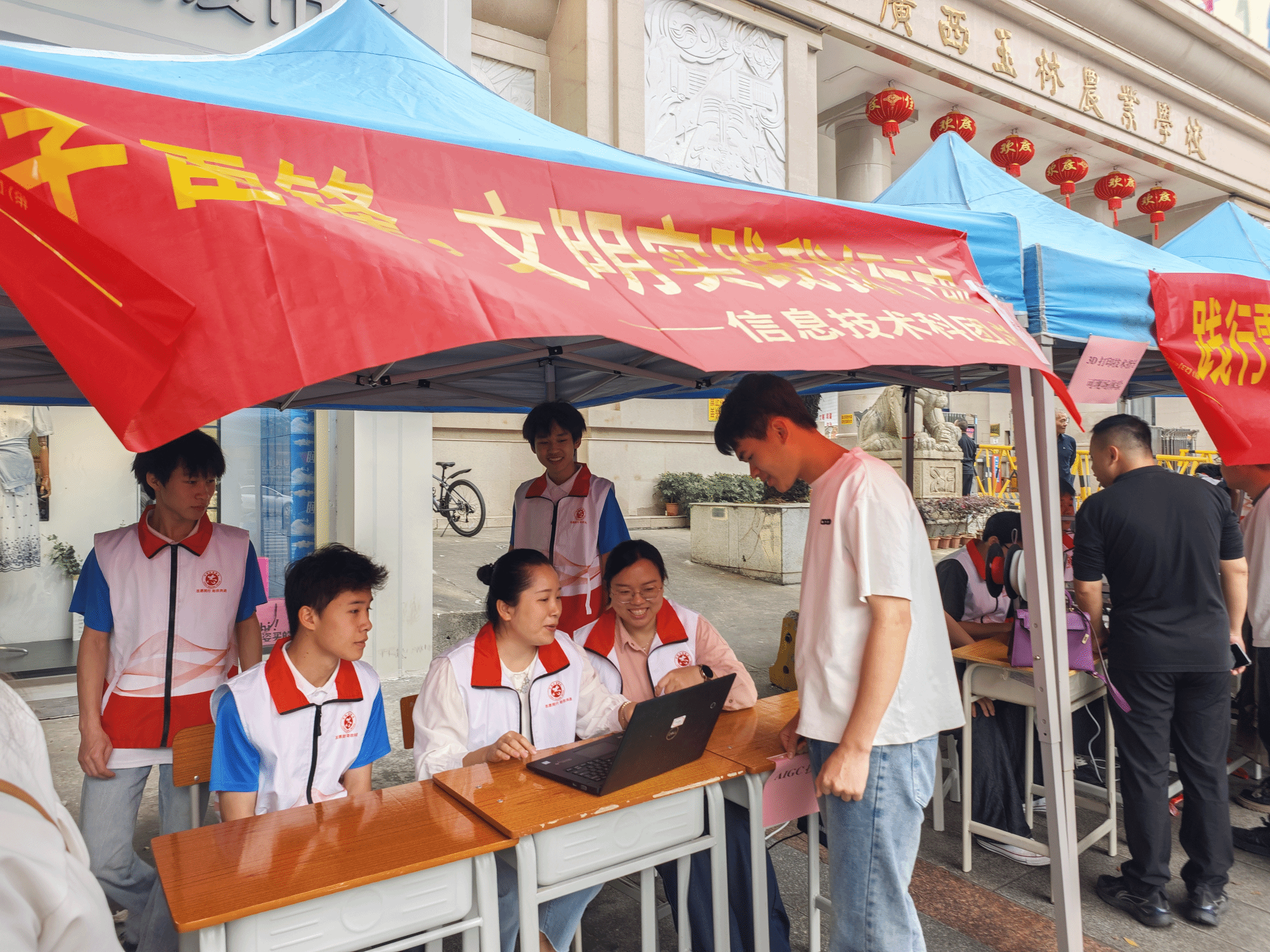 活动现场,各团总支立足专业特色打造的八大特色服务项目人气十足,成为最亮眼的“志愿风景线”。机械加工科团总支的3D创意设计体验区,让群众近距离感受科技创意的魅力;信息技术科团总支的AIGC数字技术指导台,耐心教大家运用智能工具解决生活难题,助力数字生活普及;财经商贸科团总支聚焦民生需求,开展反诈知识宣讲和个人所得税申报指导,为群众财产安全保驾护航;旅游服务与教育科团总支的雕刻展示、芒编教学现场,师生手把手传授传统技艺,让匠心文化薪火相传;农林牧渔科团总支带来的惠民空心菜售卖,以新鲜实惠的农科成果服务师生群众,尽显专业特色;交通运输科团总支的家电维修点、免费洗车服务站前排起长队,志愿者们细致排查故障、认真清洗车辆,切实解决日常小烦恼。一抹抹“志愿红”忙碌在各个服务点位,用热情的态度、扎实的技能诠释奉献内涵,让雷锋精神在实践中落地生根。