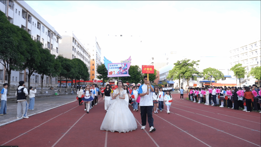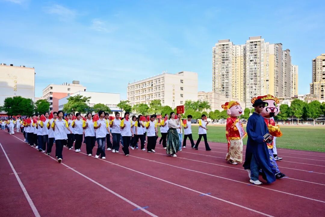 《运动员进行曲》的雄壮旋律响彻校园,国旗队、会徽队、鲜花队、醒狮队、裁判队、教师方阵、各专业科方阵依次迈着矫健的步伐入场。各专业科方阵创意迭出、精彩纷呈,巧妙融合家国情怀与 “三农” 情怀,深度融合传统文化与现代科技,生动融入企业文化与专业特色,全方位、多角度展现了广大学子朝气蓬勃、奋发向上的精神风貌。