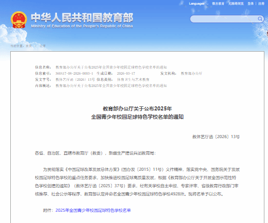 近日,教育部办公厅正式公示了2025年全国青少年校园足球特色学校认定结果,我校被教育部认定为“全国青少年校园足球特色学校”。