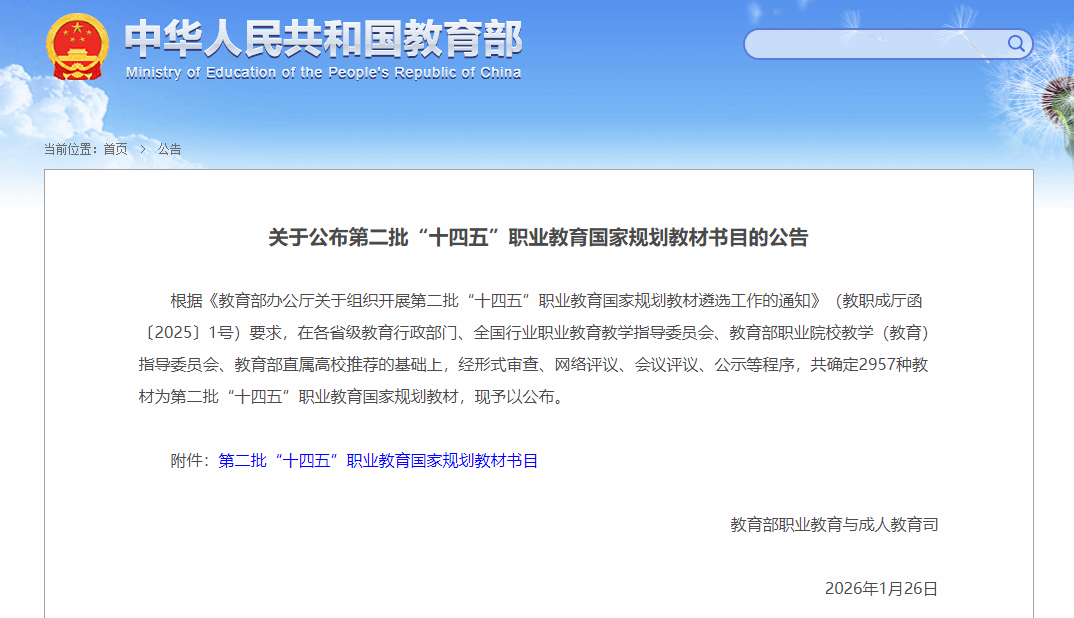 (通讯员:胡霞)近日,教育部职业教育与成人教育司公示第二批“十四五”职业教育国家规划教材书目,人力资源和社会保障部公布第五批技工教育和职业培训“十四五”规划教材入选名单,我校共3门教材入选!